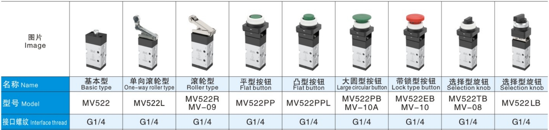 MV522 இயந்திர வால்வில் 9 வகைகள் கட்டுப்பாட்டு வகைகள் உள்ளன.