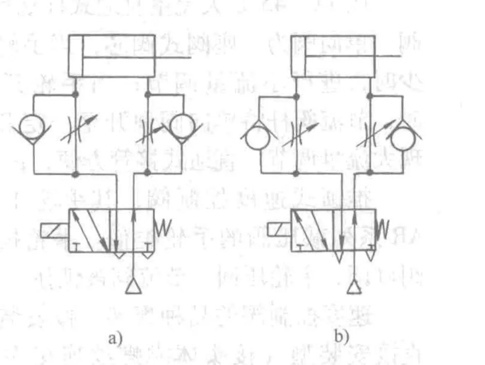 · (a)) இல் (எக்ஸாஸ்ட் த்ரோட்லிங்), திசை வால்வு இயக்கப்படும் போது, ​​சிலிண்டரின் இன்லெட் பக்கத்தில் உள்ள காசோலை வால்வு திறக்கிறது, இது கம்பி இல்லாத பக்கத்தை விரைவாக நிரப்ப அனுமதிக்கிறது. கம்பியில் உள்ள காற்று த்ரோட்டில் வால்வு வழியாக மட்டுமே வெளியேற்ற முடியும். த்ரோட்டில் திறப்பை சரிசெய்வதன் மூலம், சிலிண்டர் வேகத்தை கட்டுப்படுத்தலாம். இந்த முறை நிலையான பிஸ்டன் இயக்கத்தை வழங்குகிறது மற்றும் மிகவும் பொதுவாக பயன்படுத்தப்படும் சுற்று ஆகும்.