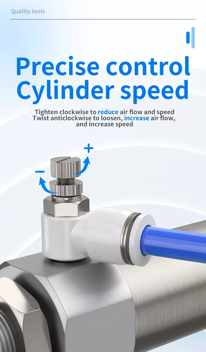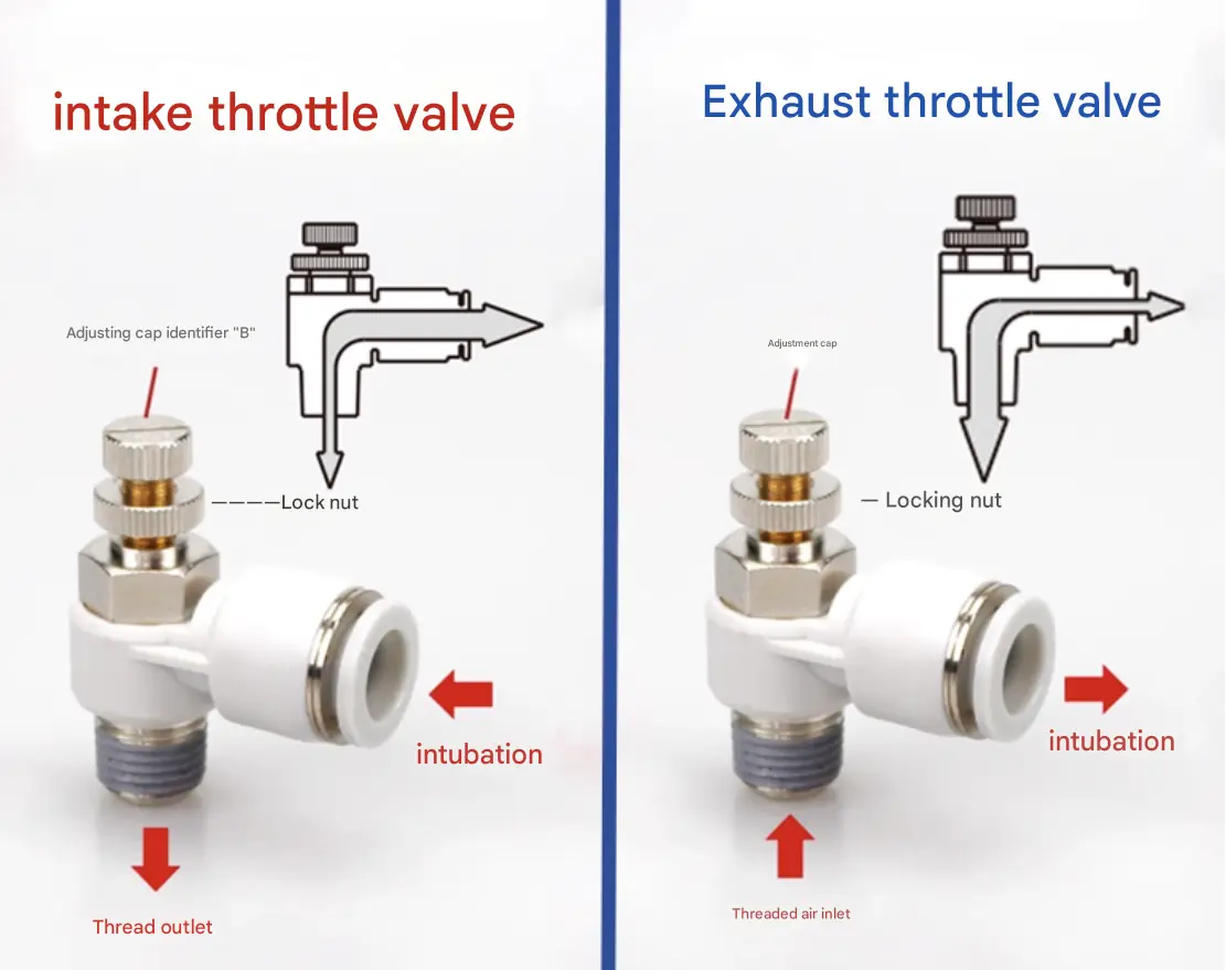 இவை இன்லெட் மற்றும் எக்ஸாஸ்ட் த்ரோட்டில் வால்வுகள், 'B' மற்றும் 'OUT' என்ற தொப்பி அடையாளங்களால் வேறுபடுகின்றன. அவை ஒன்றாகப் பயன்படுத்தப்படலாம்: இன்லெட் த்ரோட்டில் வால்வு காற்று விநியோக ஓட்டத்தை சரிசெய்கிறது, அதே நேரத்தில் எக்ஸாஸ்ட் த்ரோட்டில் வால்வு சிலிண்டர் வேகத்தைக் கட்டுப்படுத்துகிறது.