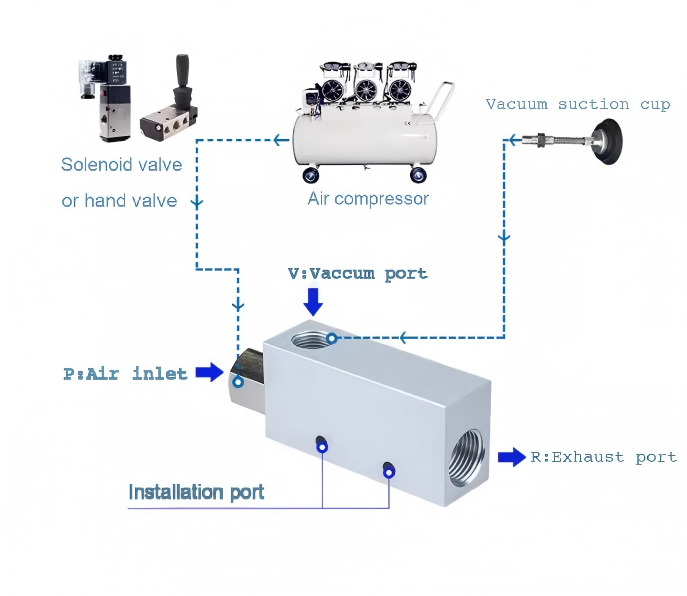 வெற்றிட ஜெனரேட்டர் என்பது ஒரு புதிய வகை திறமையான, சுத்தமான, சிக்கனமான மற்றும் சிறிய வெற்றிட கூறு ஆகும், இது எதிர்மறை அழுத்தத்தை உருவாக்க நேர்மறை அழுத்த காற்று மூலத்தைப் பயன்படுத்துகிறது. சுருக்கப்பட்ட காற்று உள்ள இடங்களில் அல்லது நியூமேடிக் அமைப்பில் நேர்மறை மற்றும் எதிர்மறை அழுத்தங்கள் தேவைப்படும் இடங்களில் எதிர்மறை அழுத்தத்தைப் பெற இது மிகவும் எளிதானது மற்றும் வசதியானது.