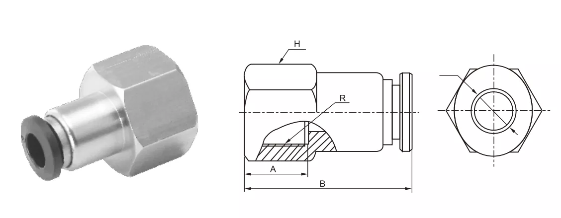 குழாய் பொருத்துதல் அவுட்லைன் பரிமாண அளவுருக்களில் பிசிஎஃப் பெண் நேராக உந்துதல்