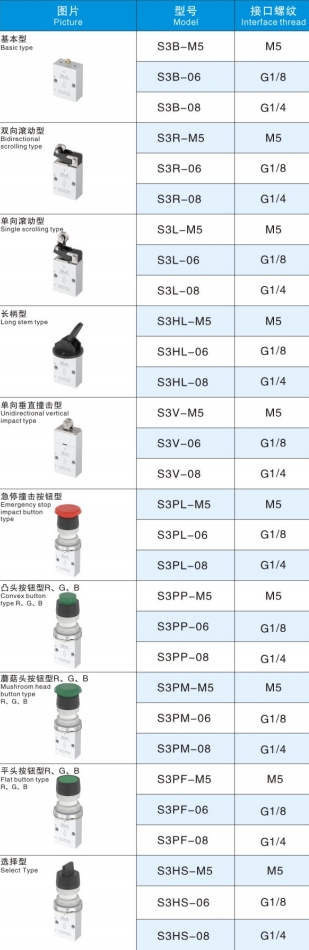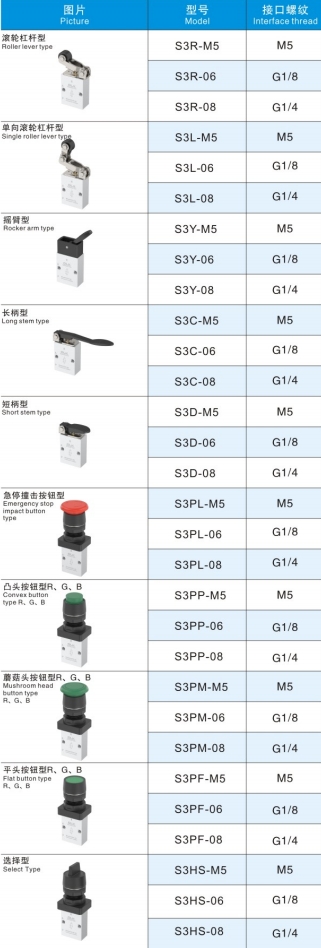 எஸ் 3 தொடர் இயந்திர பொத்தான் கட்டுப்பாட்டு வால்வு 3 வழி பொது அளவுருக்கள்